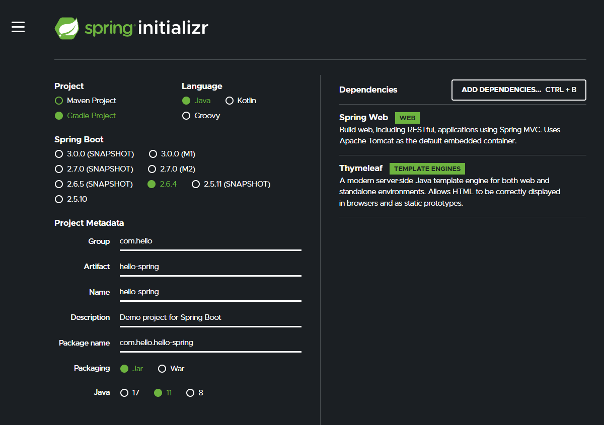 Gradle Proejct / Java / 2.6.4 / Spring Web / Thymeleaf