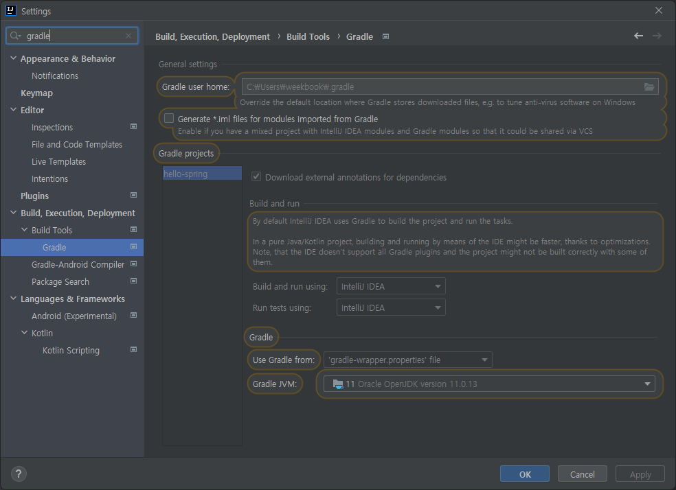 IntelliJ는 Gradle을 통해서 실행 하는 것이 기본 설정이다. 이렇게 하면 실행속도가 느리므로 IntelliJ IDEA로 변경한다.
