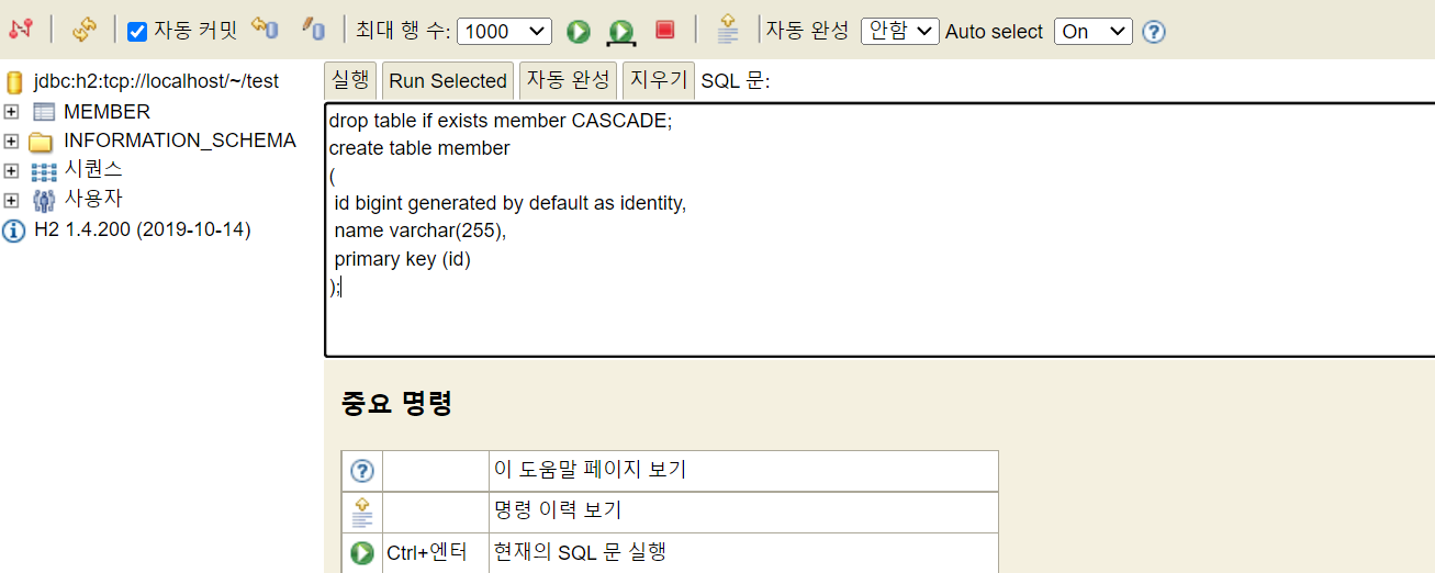H2 DB에 접속 후 위 쿼리문을 입력해서 member 테이블을 만들어준다.