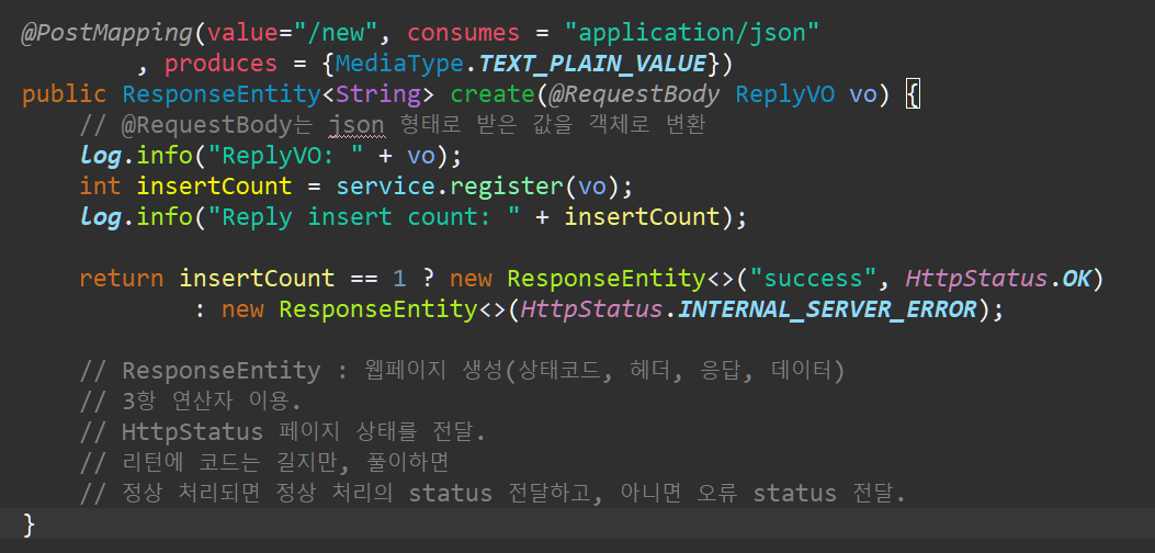 return으로 제대로 등록했으면 insertCount가 1일것이다. 그럼 ResponseEntity로 "success" 결과를 보내줌으로서