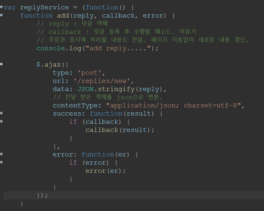 이제 reply.js를 수정하여 댓글 등록 메소드를 구현한다.